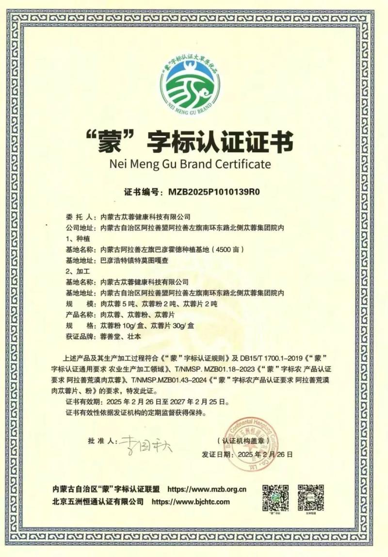 內(nèi)蒙古蓯蓉健康科技有限公司隸屬內(nèi)蒙古阿拉善蓯蓉集團有限責任公司,主要負責肉蓯蓉種植基地建設,以及肉蓯蓉食藥同源產(chǎn)品的生產(chǎn)與銷售。目前,公司已建成6萬畝高標準梭梭—肉蓯蓉高產(chǎn)穩(wěn)產(chǎn)示范基地,并獲評國家林下經(jīng)濟示范基地稱號。公司產(chǎn)品相繼通過有機產(chǎn)品認證、中國森林認證、生態(tài)原產(chǎn)地保護產(chǎn)品認證、道地藥材認證和7S道地保真管理體系認證,全方位保障產(chǎn)品的生態(tài)有機特性與全程可追溯性。