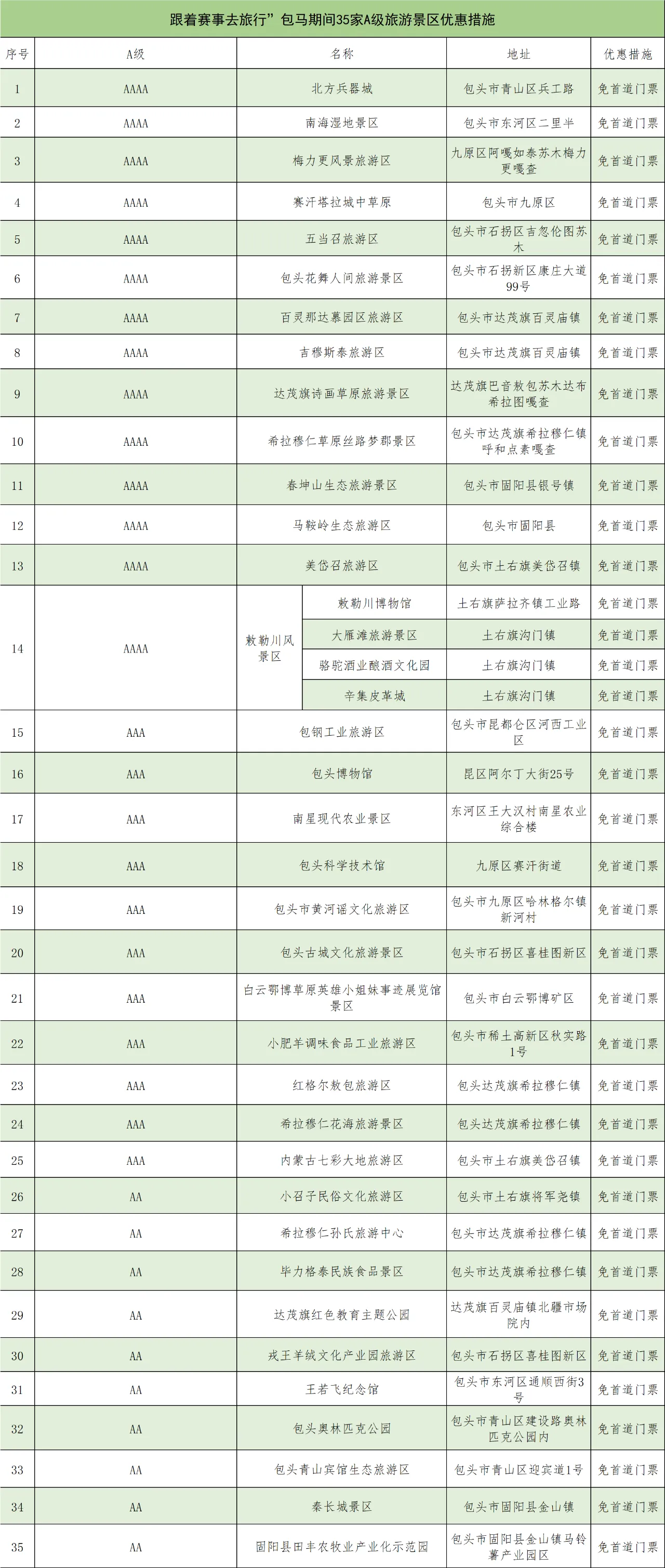 2025包頭馬拉松即將開(kāi)跑,這場(chǎng)備受矚目的賽事吸引眾多跑友齊聚包頭,用腳步丈量這座美麗的城市。馬拉松期間(5月18~19日),包頭文旅為參賽人員(憑號(hào)碼簿、中簽短信、手環(huán))推出全市35家A級(jí)旅游景區(qū)免收首道門(mén)票的優(yōu)惠政策,還將“上線”多項(xiàng)特色活動(dòng)。