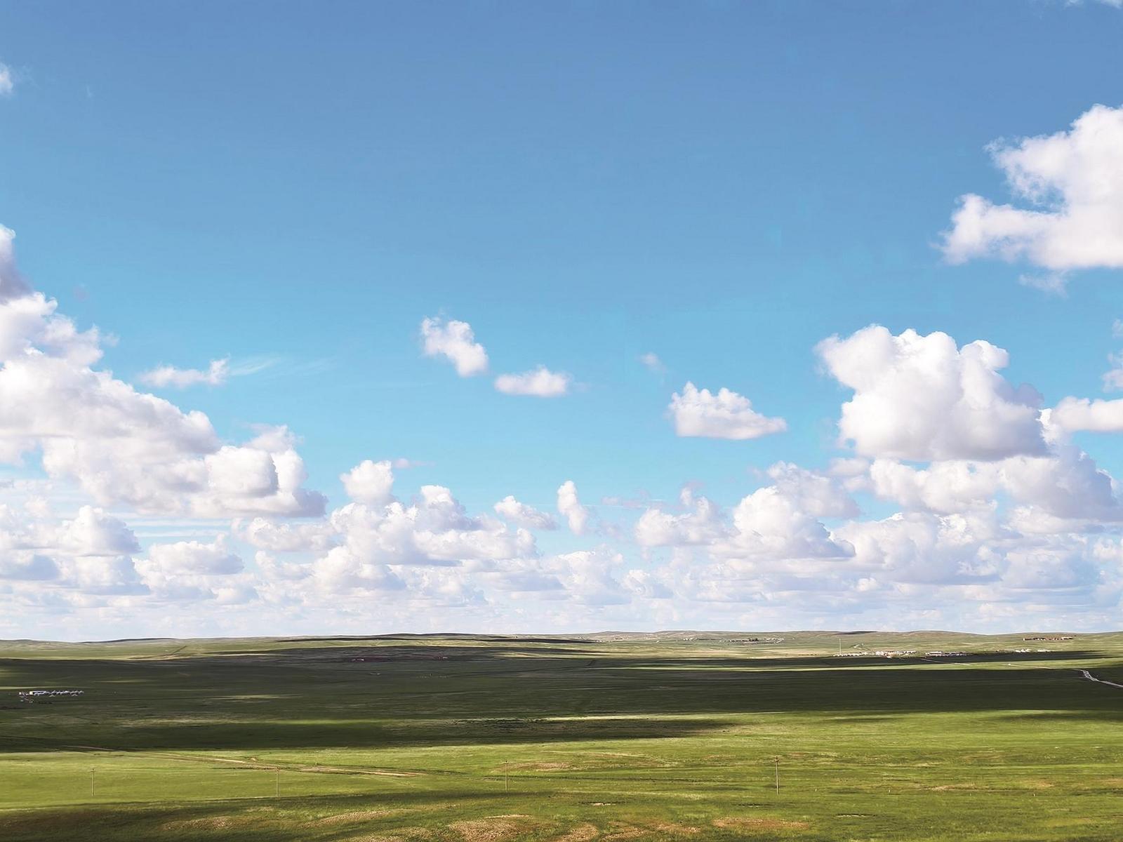藍(lán)天、白云、大草原。