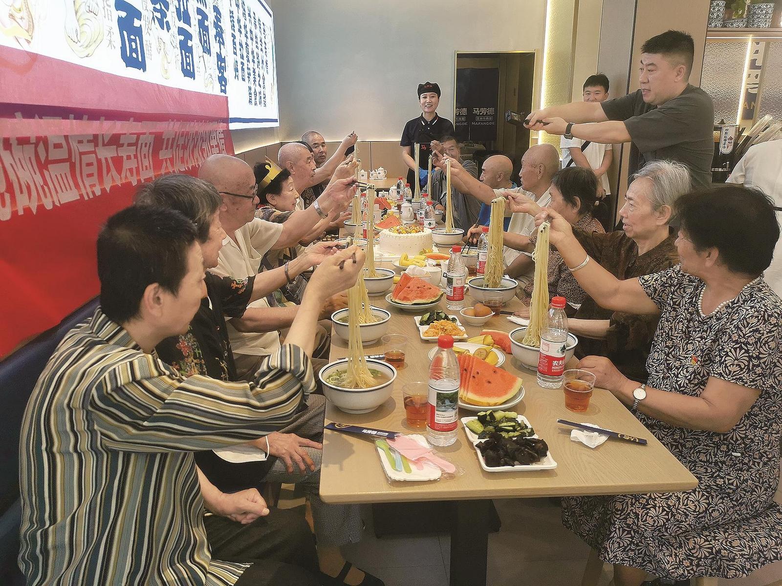 老人們舉起筷子感受長(zhǎng)壽面的溫暖。