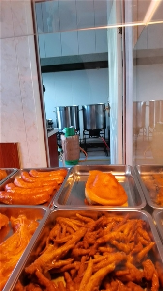 進入后廚,各種物品擺放整齊,4口明亮的不銹鋼鍋架在爐子上,其中一口鍋正在煮雞肉,廚房比較干凈。男店主介紹,每口鍋煮的東西都不一樣。