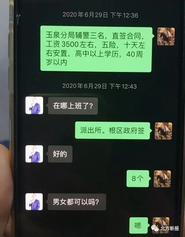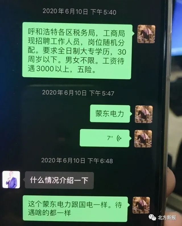 “呼和浩特各區(qū)消防大隊(duì)招聘辦公室內(nèi)勤人員,工資待遇3500元左右。”“高速交警呼市支隊(duì)(一支隊(duì))輔警,工資和五險(xiǎn)一金,4200元?!薄昂艉秃铺馗鲄^(qū)稅務(wù)局、工商局現(xiàn)招聘工作人員,崗位隨機(jī)分配?!薄昂艉秃铺貗D幼保健院招聘護(hù)士,大專學(xué)歷”……記者在民警繳獲的程某某的手機(jī)上看到,6月8日以來(lái),程某某和趙某某的聊天記錄中,發(fā)送了多條諸如此類的招聘信息。