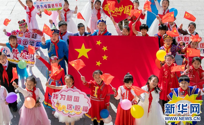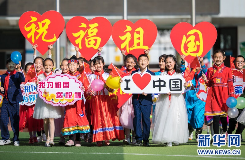 9月29日,內(nèi)蒙古呼和浩特市玉泉區(qū)五塔寺東街小學學生在主題快閃活動上,祝福偉大祖國繁榮昌盛。新華網(wǎng)發(fā)(丁根厚攝)