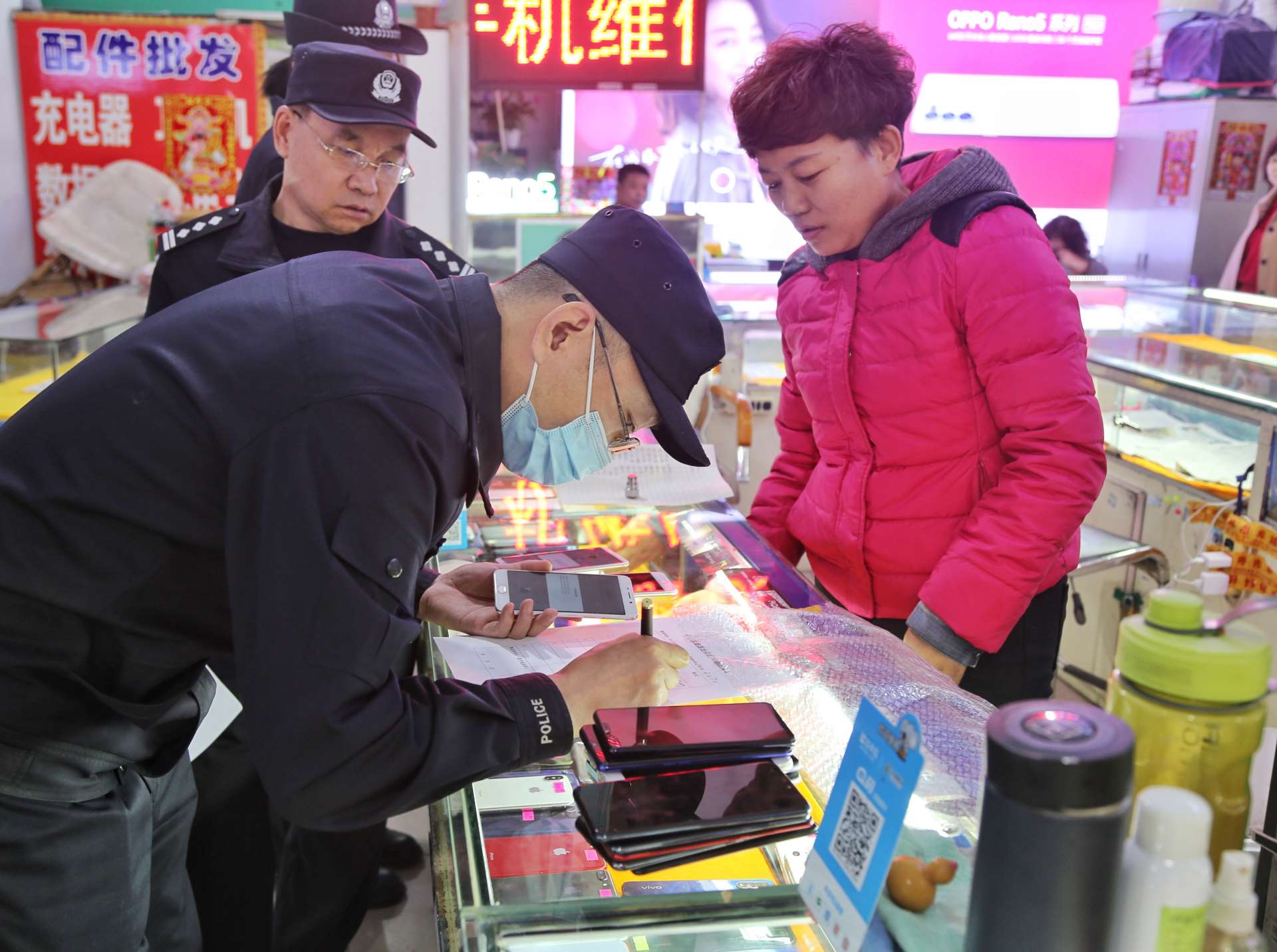 按照預定方案,行動分為四組,兩組對永和二手手機市場和眾興二手手機市場進行突擊清查,另兩組以便衣形式對周圍流動收售手機人員進行排查。行動期間,民警對二手手機銷售店鋪內的手機和工作人員情況進行清查,逐一對照登記臺賬,嚴格檢查落實情況,同時向經營業(yè)主及市民進行法制宣傳教育。此次行動共排查登記二手手機850部,買賣二手手機人員50余人,檢查二手手機商戶22家,暫扣未履行登記手機30余部。