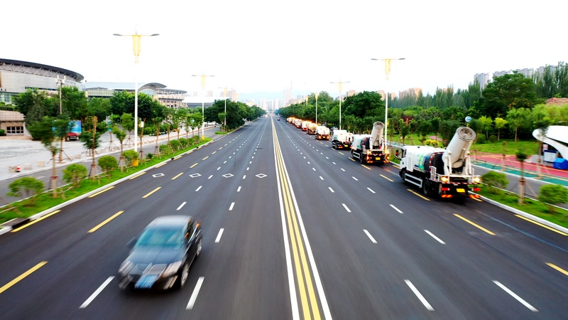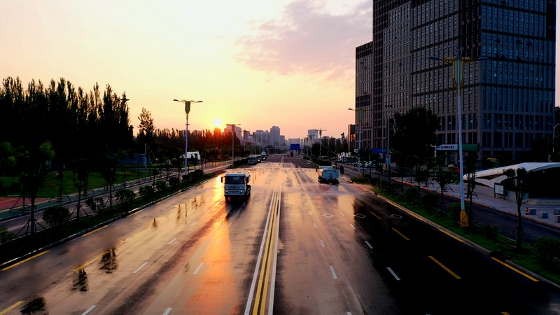 當(dāng)東方微微發(fā)白,高壓沖洗車(chē)強(qiáng)力開(kāi)路,將道路上的廢棄物、積灰沖到道路兩側(cè)。