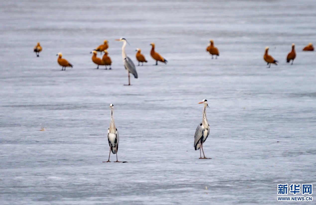 在土默特左旗海流水庫(kù)冰面上,候鳥(niǎo)在悠閑覓食。新華網(wǎng)發(fā)(陽(yáng)光 攝)