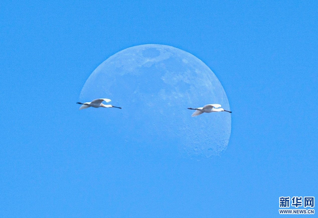 兩只候鳥(niǎo)在內(nèi)蒙古自治區(qū)土默特左旗海流水庫(kù)上空飛翔。新華網(wǎng)發(fā)(楊鑫 攝)