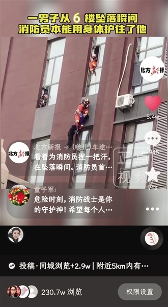 朱先生目睹了整個(gè)救援過程,他告訴記者:“那名男子坐在窗戶外沿,搖搖欲墜。雖然是6樓,但這是寫字樓,復(fù)式結(jié)構(gòu),相當(dāng)于普通住宅10樓的高度,非常危險(xiǎn)!就在墜落瞬間,消防員本能地用自己身體護(hù)住了他!為他們點(diǎn)贊!”