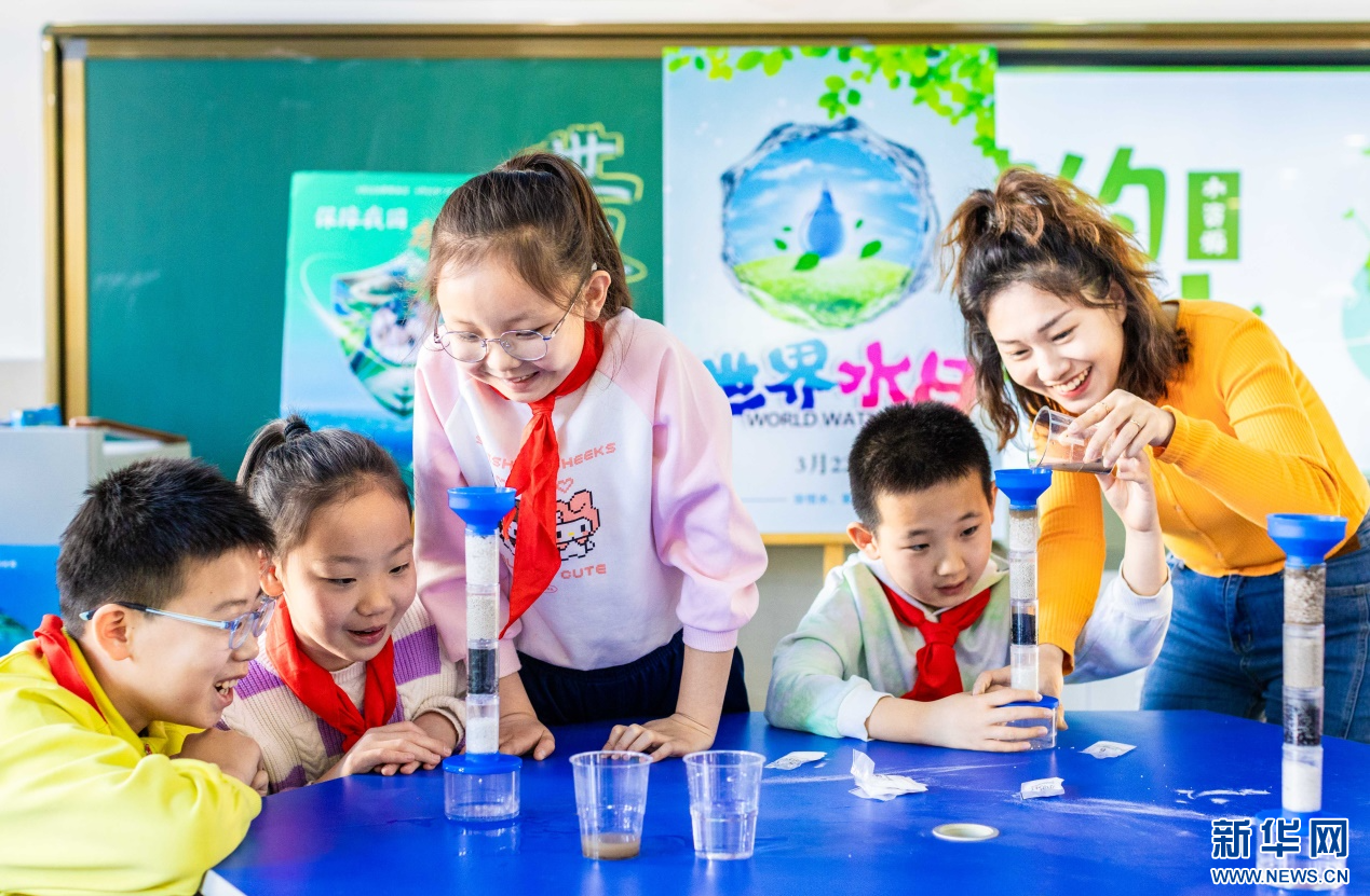 ??3月20日,呼和浩特市玉泉區(qū)石東路小學(xué)老師向?qū)W生們講解“保障我國水安全”等知識。新華網(wǎng)發(fā)(丁根厚 攝)
