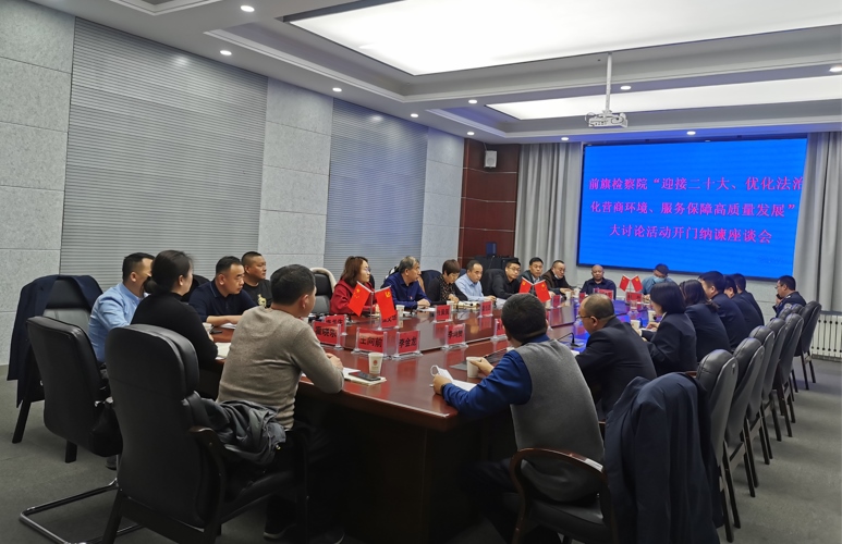 會(huì)上傳達(dá)了全區(qū)優(yōu)化營商環(huán)境的會(huì)議精神,通報(bào)了察右前旗人民檢察院“迎接二十大、優(yōu)化法治化營商環(huán)境、服務(wù)保障高質(zhì)量發(fā)展”大討論活動(dòng)開展情況,介紹了院黨組下一步優(yōu)化法治化營商環(huán)境工作計(jì)劃,并希望與會(huì)代表暢所欲言,就企業(yè)發(fā)展中遇到的問題和困難以及察右前旗人民檢察院在優(yōu)化法治化營商環(huán)境方面存在的不足進(jìn)行座談交流。