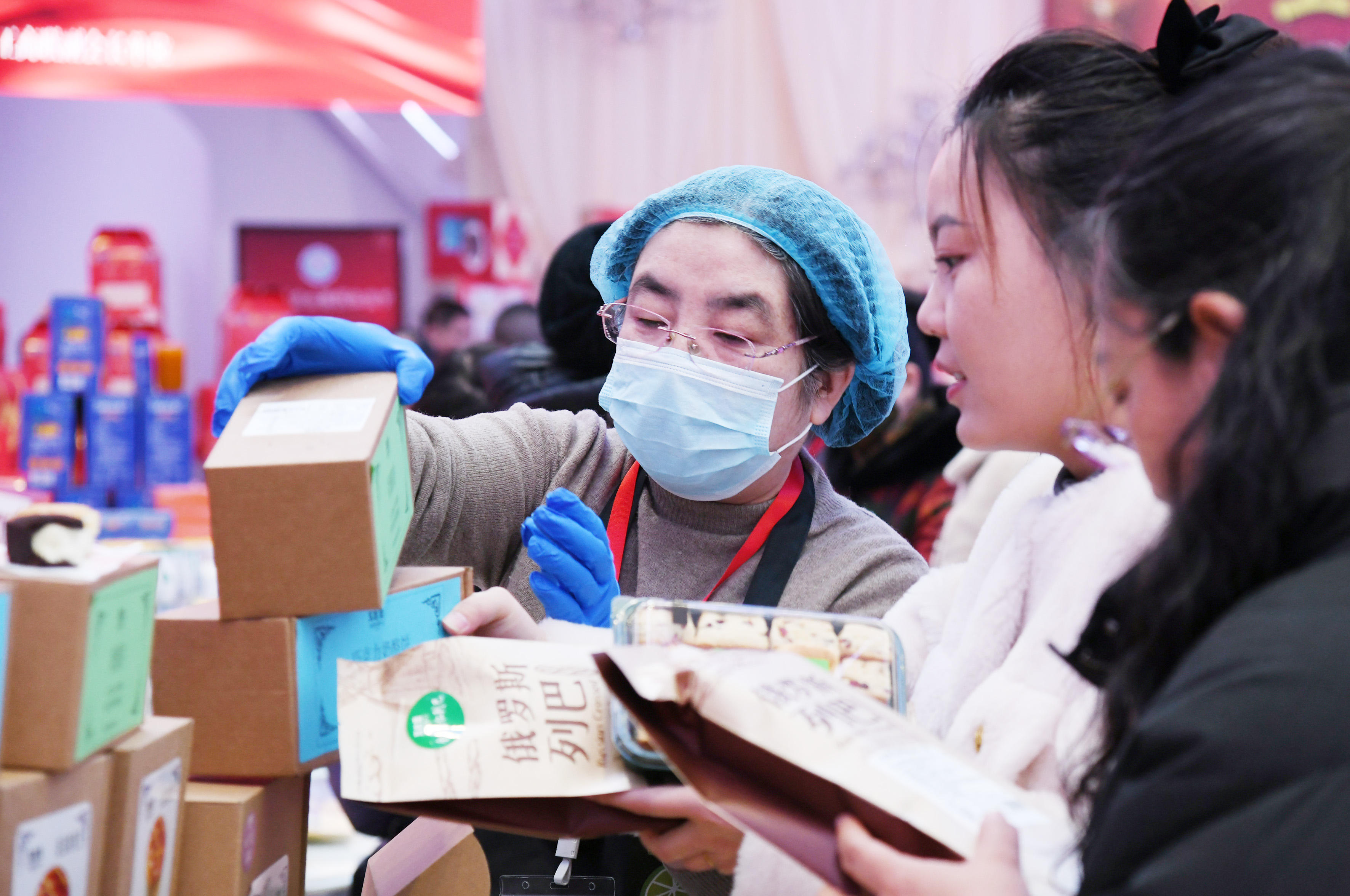 紅毯鋪地、燈籠高掛,熙熙攘攘的人群中,商家的吆喝聲此起彼伏。展位上,散發(fā)著誘人香氣的熟食禮盒、各式各樣的堅(jiān)果奶食、豐富多樣的非遺制品……品類齊全的年貨商品整齊擺放。展位前,擠滿了購(gòu)買年貨的顧客,大家走走停停、挑挑揀揀,認(rèn)真挑選著心儀的產(chǎn)品,感受著家門口濃濃的“年味”。
