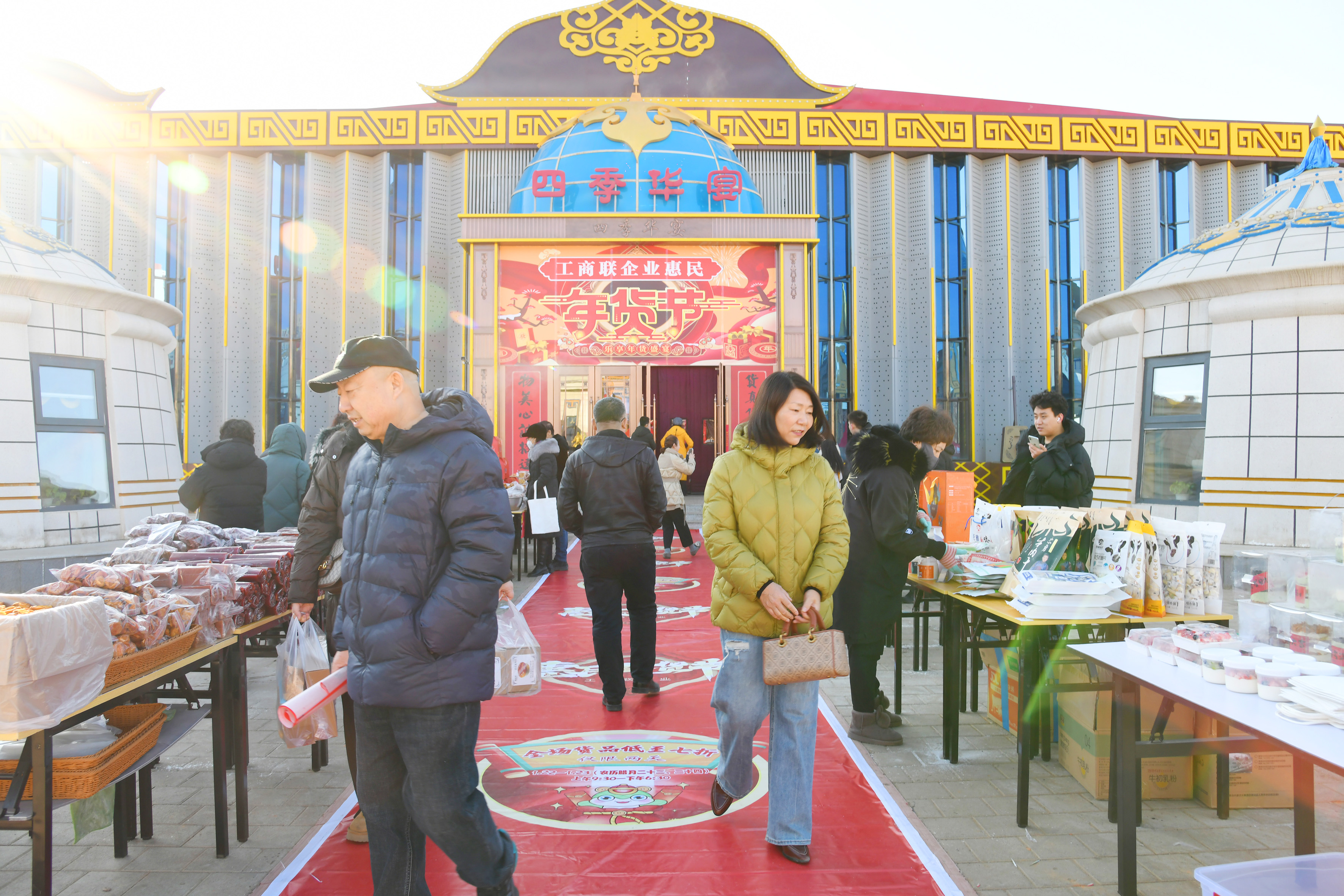 “肘子、熏雞、麻花、糖棗、奶豆腐!”“現(xiàn)出鍋醬牛肉,肥嫩多汁,快來(lái)嘗嘗!”……1月22日,工商聯(lián)惠民年貨節(jié)在集寧區(qū)察哈爾部落?四季華宴火熱開市。