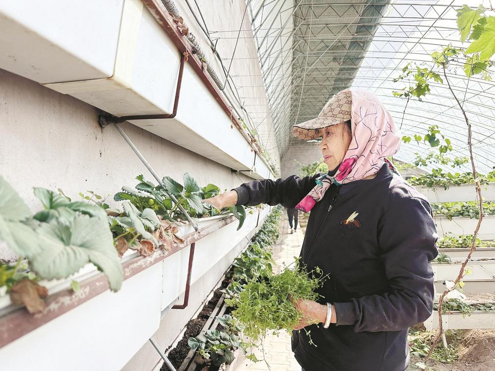 走進(jìn)草莓大棚內(nèi),濃濃的暖意撲面而來。抬眼望去,離地一米多的種植架上種滿了生機(jī)勃勃、長勢喜人的草莓;穿梭在種植架間,一顆顆鮮紅欲滴、圓潤飽滿的草莓宛如璀璨的紅寶石,從綠葉間“探出頭”來,高高地懸掛在空中,散發(fā)著誘人的清香。種植戶牛尚海正在察看采用立體栽培技術(shù)的草莓長勢情況?!斑@是一種三維立體種植方式,能夠充分利用空間和光照,大幅度提高生產(chǎn)效率。以前一畝地最多種8000株,現(xiàn)在能種2.4萬株,產(chǎn)量提高了3倍,而且草莓個頭更均勻,賣相更好?!迸I泻8嬖V記者,這種種植方式不僅省工、省力,還降低了勞動強(qiáng)度,摘草莓也不用彎腰了。此外,這種種植模式比傳統(tǒng)種植模式每畝節(jié)水50%。