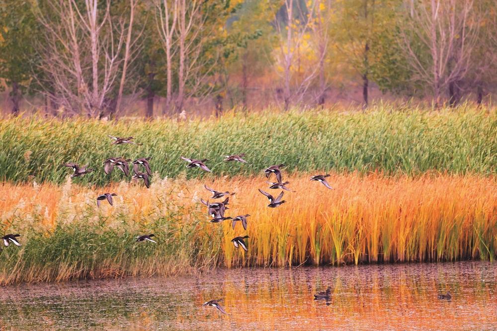 沿著黃河岸邊的公路前行,不遠(yuǎn)處便是龍游灣國(guó)家濕地公園。這里的秋景更是別有一番風(fēng)味。樹木褪去了翠綠,換上了耀眼的金黃,廣袤的田野里,一捆捆草垛錯(cuò)落有致地散布在草地上,訴說著豐收的喜悅。遠(yuǎn)處的蘆葦蕩與天際線相連,蘆葦花在風(fēng)中輕舞,時(shí)而聚攏、時(shí)而散開,與水面上掠過的水鳥構(gòu)成靈動(dòng)的剪影。林間的候鳥也多了起來,一群群白鷺在水面上盤旋,偶爾俯沖下去,叼起一條小魚,然后又展翅飛向遠(yuǎn)方,給這片寧靜的濕地增添了幾分生機(jī)與活力。