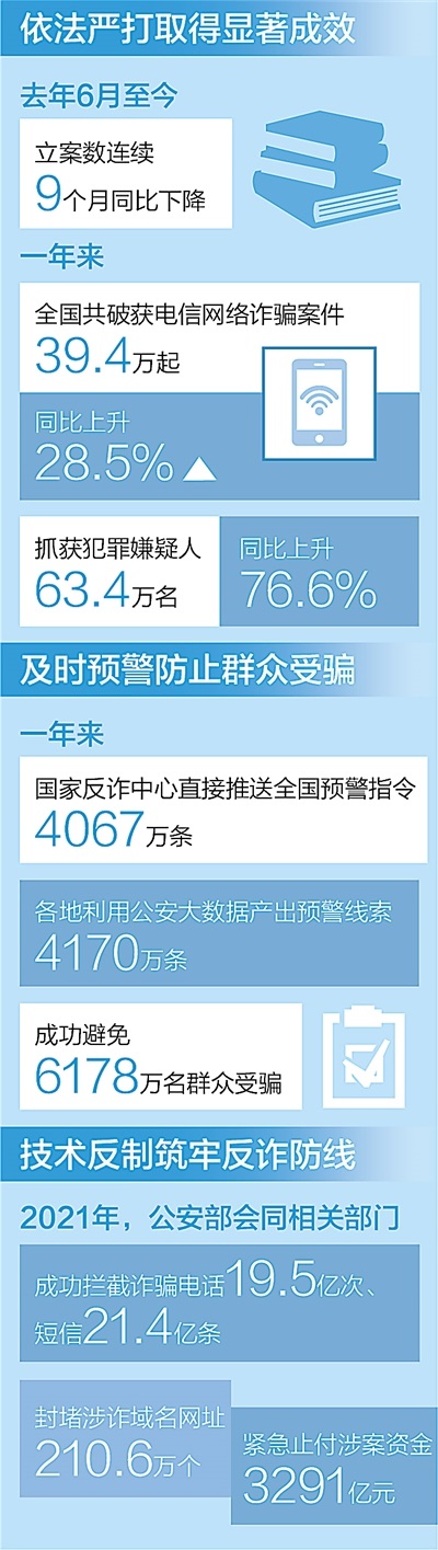 據(jù)介紹,全國公安機(jī)關(guān)深入開展“云劍”“長(zhǎng)城”“斷卡”“斷流”“5·10”等專項(xiàng)行動(dòng),先后組織開展150次全國集群戰(zhàn)役。一年來,共破獲電信網(wǎng)絡(luò)詐騙案件39.4萬起,抓獲犯罪嫌疑人63.4萬名,同比分別上升28.5%和76.6%。根據(jù)最新統(tǒng)計(jì),電信網(wǎng)絡(luò)詐騙立案數(shù)連續(xù)9個(gè)月同比下降,打擊治理工作取得顯著成效。
