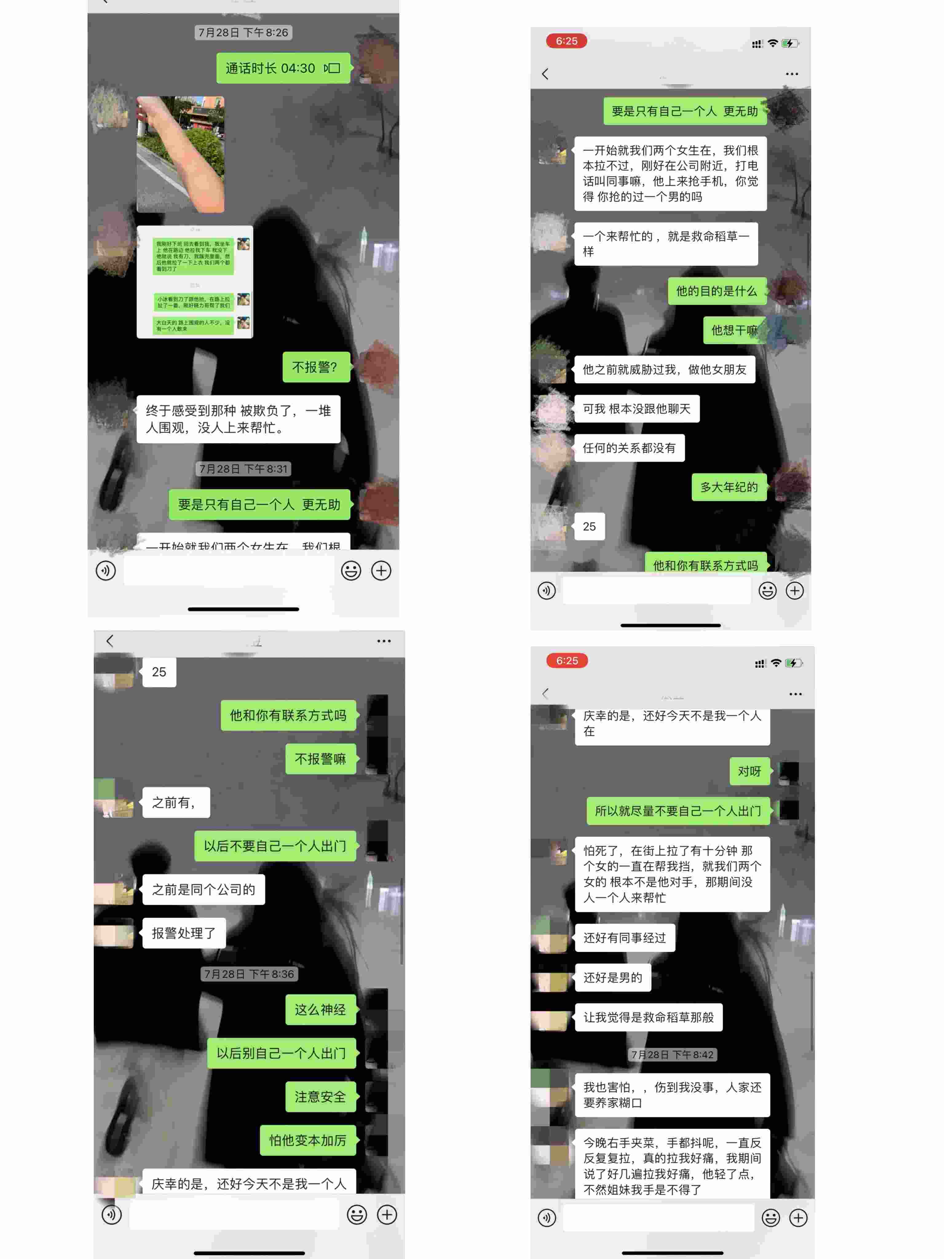 相關(guān)聊天截圖顯示,此次被黃某南威脅后,陳某萍和朋友在微信聊天時(shí)表示,“報(bào)警處理了”。陳某萍還表示,當(dāng)時(shí),黃某南拉她上衣時(shí),她看到了刀,感到非常害怕,幸好有同事出手相助。“他之前就威脅過(guò)我,做他女朋友。可我根本沒(méi)跟他聊天,任何關(guān)系都沒(méi)有?!?/p>