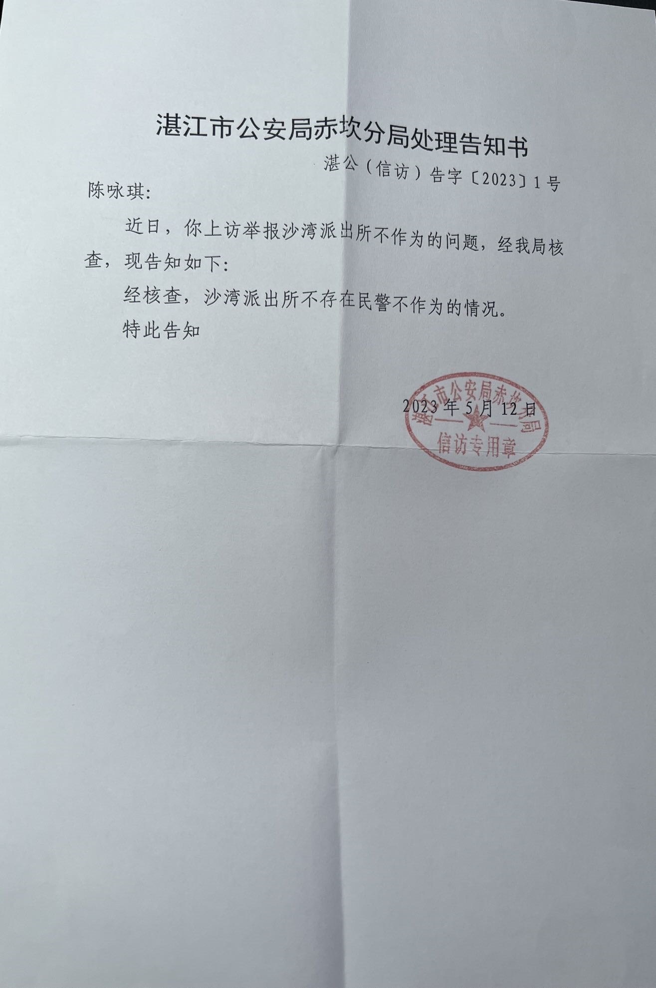 5月12日,湛江市公安局赤坎分局作出的《處理告知書(shū)》顯示,該公安分局表示,經(jīng)核查,沙灣派出所不存在民警不作為的情況。