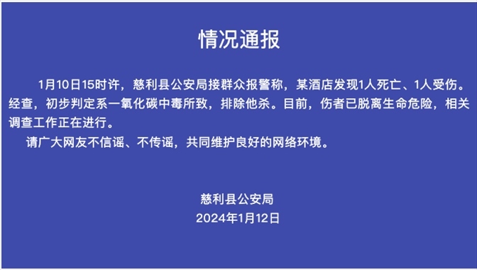 湖南慈利一酒店發(fā)現(xiàn)1人死亡、1人受傷,警方:初判系一氧化碳中毒所致 1月12日,湖南慈利縣公安局通報(bào),1月10日15時(shí)許,慈利縣......
