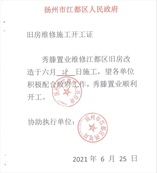 “搞定”西苑社區(qū)后,楊某軍偽造一份《揚州市江都區(qū)人民政府舊房維修施工開工證》,并加蓋“揚州市江都區(qū)人民政府 178962”“揚州市江都區(qū)規(guī)劃局”公章。周女士獲得該證后,立即組織顧先生進場施工?!皸钅耻娮屛蚁葔|付材料款和人工費,后面等財政撥款就行。我就安排顧先生7月1日進場施工?!?/p>