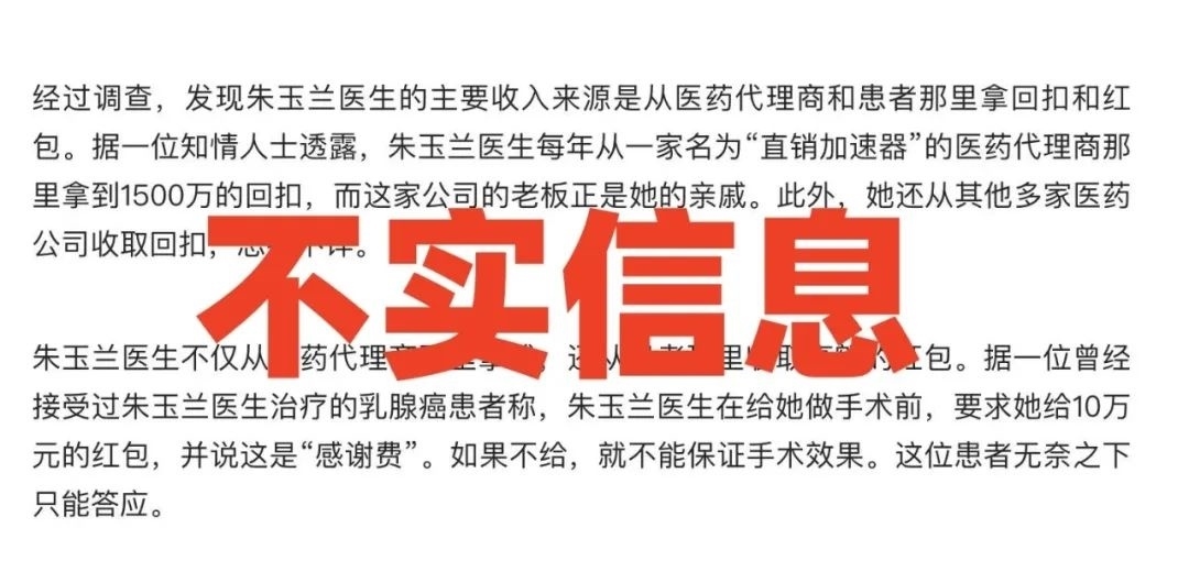 值得一提的是,該文將“抄家1.5億、20套房子”和“朱某某醫(yī)生的主要收入來源是從醫(yī)藥代理商和患者那里拿回扣和紅包”等信息列為“不實(shí)信息”,但未否認(rèn)“朱某某被抓”。