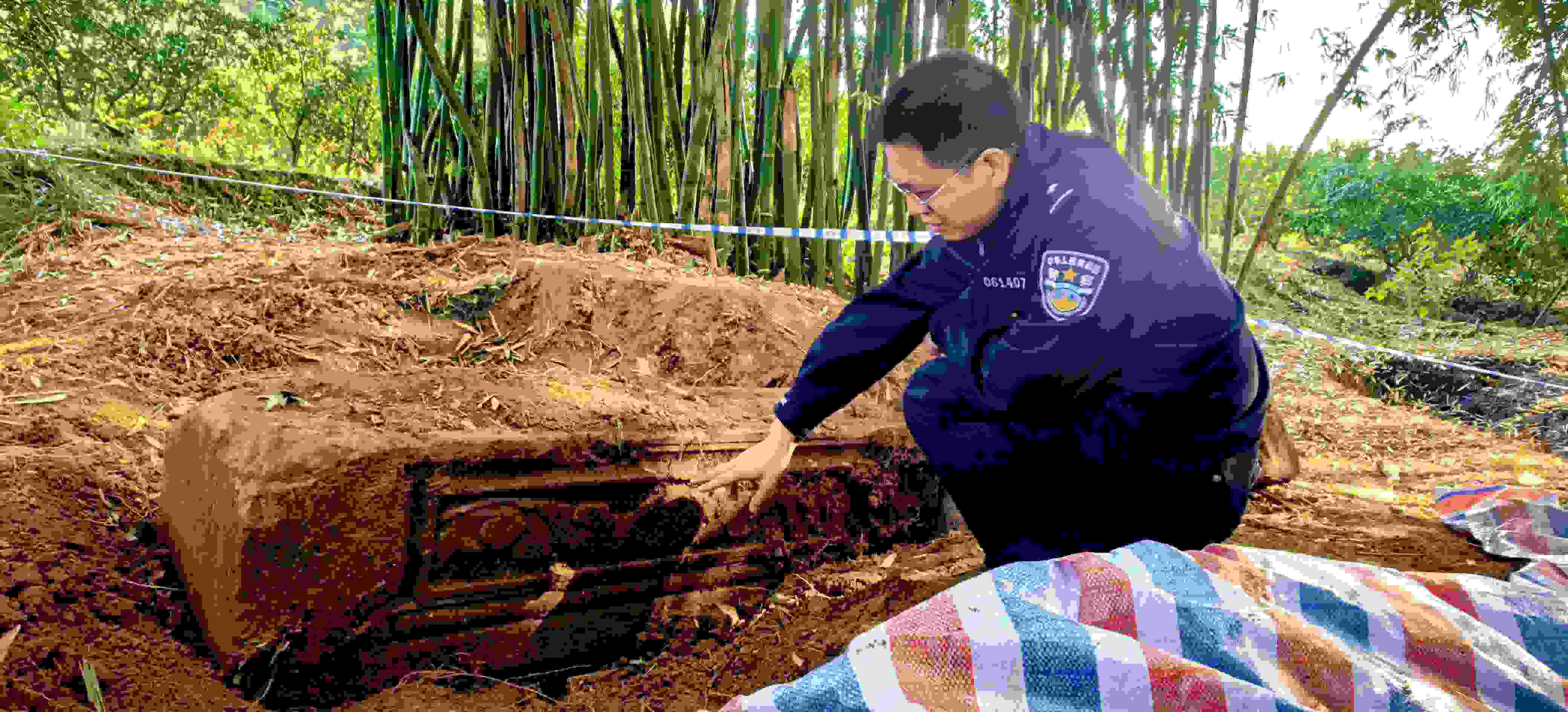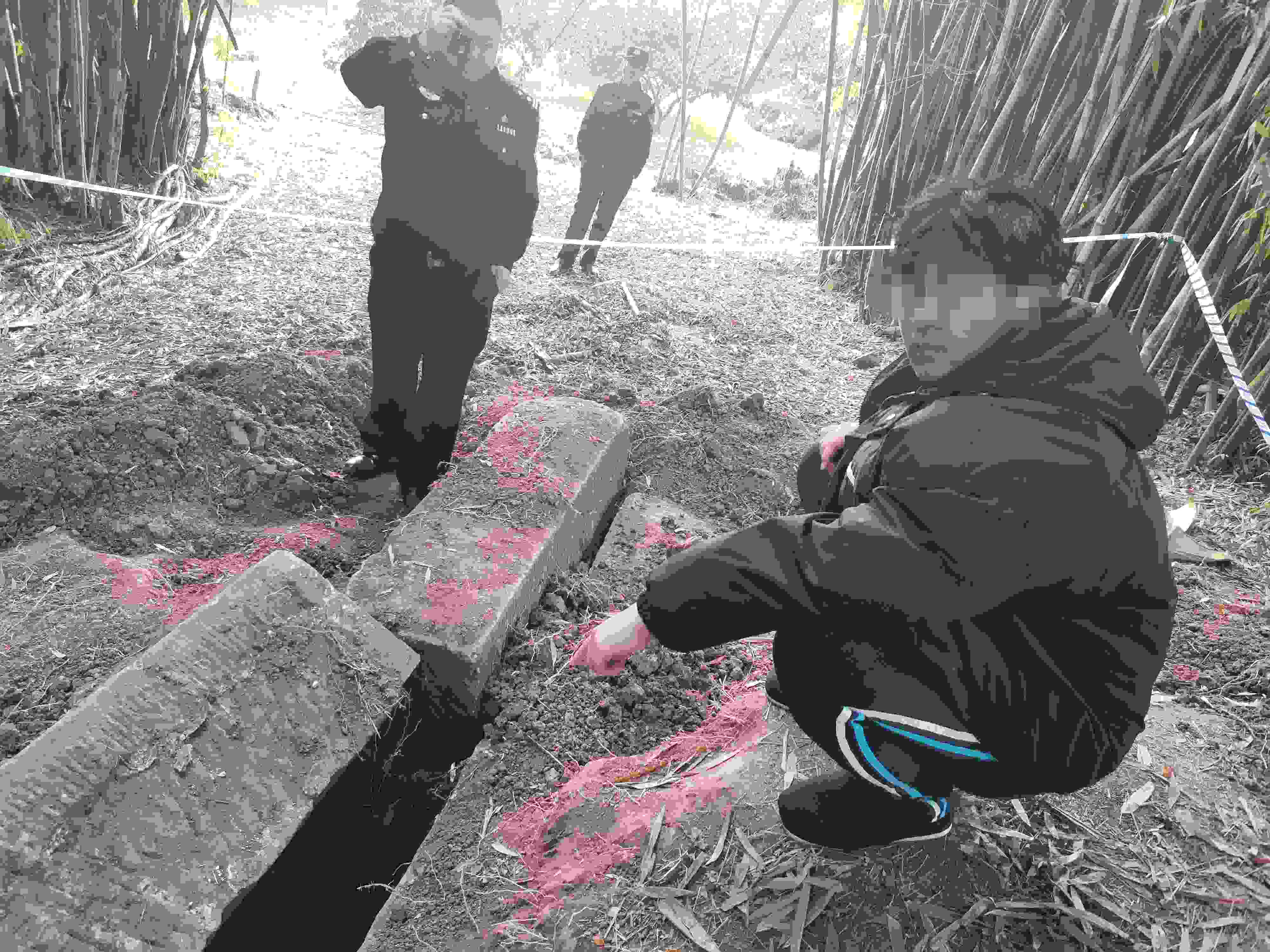 韓某家族的這座祖墳地處一片竹林中,離最近的房屋直線距離不足20米。為此,他趕到現(xiàn)場發(fā)現(xiàn),墓室上的土有多處被挖痕跡,但墓門上的石頭還沒被打開。“這個(gè)地方是條大路,白天也沒人看到有人來過?!表n某懷疑有人盯上了他家的祖墳,想要盜墓,并判斷那些人還會(huì)再來。