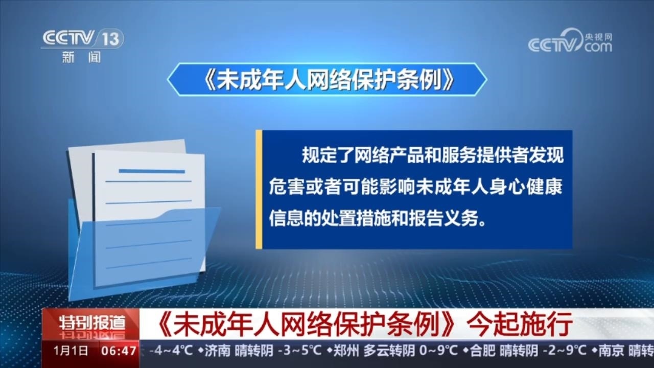 1月1日起施行的《未成年人網(wǎng)絡保護條例》是我國第一部專門性的未成年人網(wǎng)絡保護綜合立法。條例規(guī)定,網(wǎng)絡產(chǎn)品和服務提供者發(fā)現(xiàn)危害或者可能影響未成年人身心健康信息的處置措施和報告義務。