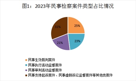 2023年,全國檢察機關(guān)民事檢察監(jiān)督規(guī)模進一步擴大,全流程監(jiān)督格局逐步完善,總體發(fā)展保持均衡態(tài)勢。全年共受理各類民事檢察案件33.29萬件,案件數(shù)量持續(xù)上升。其中,民事生效裁判案件占受理總數(shù)的25%,民事執(zhí)行活動監(jiān)督案件占23%,民事審判活動監(jiān)督案件占21%,民事支持起訴案件、民事虛假訴訟監(jiān)督案件等其他類案件占31%。