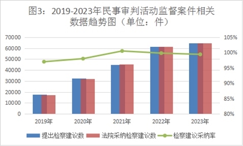 2023年,全國檢察機關(guān)共受理民事審判活動監(jiān)督案件6.94萬件,同期審結(jié)6.96萬件(含積存)。提出檢察建議6.47萬件,同比上升5.1%,占審結(jié)案件數(shù)的93%,同比增加4.2個百分點。對提出的檢察建議,法院同期采納6.46萬件,檢察建議采納率達99%。一些地區(qū)通過開展專項監(jiān)督,加強辦案力度,提高辦案效果,推動民事審判活動監(jiān)督向深層次違法監(jiān)督轉(zhuǎn)變。