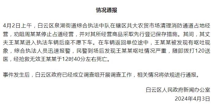央視網(wǎng)消息:據(jù)貴陽(yáng)網(wǎng)官微消息,4月3日,貴陽(yáng)市白云區(qū)人民政府新聞辦公室通報(bào),4月2日上午,白云區(qū)泉湖街道綜合執(zhí)法中隊(duì)在轄區(qū)共大農(nóng)貿(mào)市場(chǎng)清理消防通道占地經(jīng)營(yíng),勸阻周某某停止占道經(jīng)營(yíng),并對(duì)其所經(jīng)營(yíng)商品采取先行登記保存措施。其間,其丈夫王某某進(jìn)入執(zhí)法車輛后座不愿下車。在車輛返回單位途中,王某某被發(fā)現(xiàn)有嘔吐現(xiàn)象,綜合執(zhí)法人員迅速報(bào)警,民警到場(chǎng)后發(fā)現(xiàn)王某某嘔吐情況嚴(yán)重,隨即撥打120送醫(yī),經(jīng)搶救無(wú)效王某某于12時(shí)40分左右死亡。