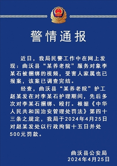 經(jīng)查,曲沃縣“某養(yǎng)老院”護(hù)工趙某發(fā)在對(duì)李某石護(hù)理期間,先后多次對(duì)李某石捆綁、毆打。根據(jù)《中華人民共和國治安管理處罰法》第四十三條之規(guī)定,曲沃縣公安局于2024年4月25日對(duì)趙某發(fā)處以行政拘留十五日并處500元罰款。