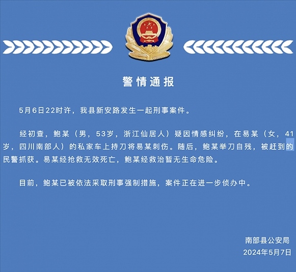 ·四川南部縣警方:男子持刀刺死一女子后自殘,已被采取刑事強(qiáng)制措施。