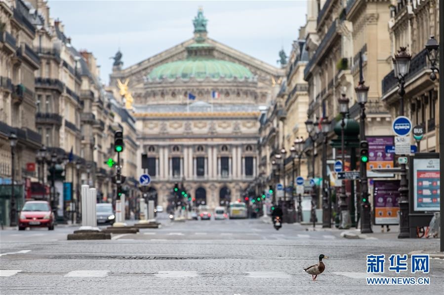 這是4月6日,在法國巴黎,一只鴨子在巴黎歌劇院前的大道上“溜達”。“禁足令”實施期間,不少動物“溜達”到巴黎空蕩無人的大街上。新華社發(fā)(奧雷利安·莫里薩爾攝)