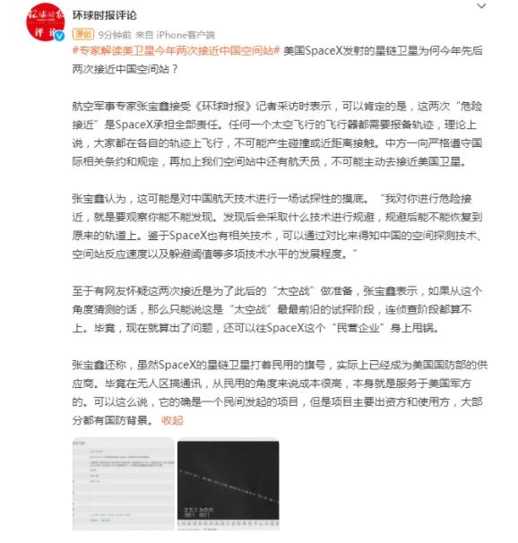 航空軍事專家張寶鑫接受《環(huán)球時(shí)報(bào)》記者采訪時(shí)表示,可以肯定的是,這兩次“危險(xiǎn)接近”是SpaceX承擔(dān)全部責(zé)任。任何一個(gè)太空飛行的飛行器都需要報(bào)備軌跡,理論上說(shuō),大家都在各自的軌跡上飛行,不可能產(chǎn)生碰撞或近距離接觸。中方一向嚴(yán)格遵守國(guó)際相關(guān)條約和規(guī)定,再加上我們空間站中還有航天員,不可能主動(dòng)去接近美國(guó)衛(wèi)星。
