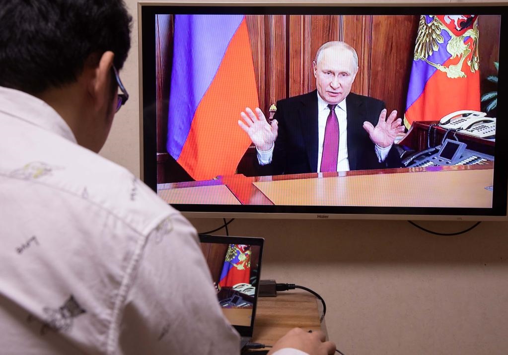 俄羅斯總統(tǒng)普京24日清晨發(fā)表電視講話(huà)說(shuō),決定在頓巴斯地區(qū)發(fā)起特別軍事行動(dòng)。(新華社記者白雪騏攝)
