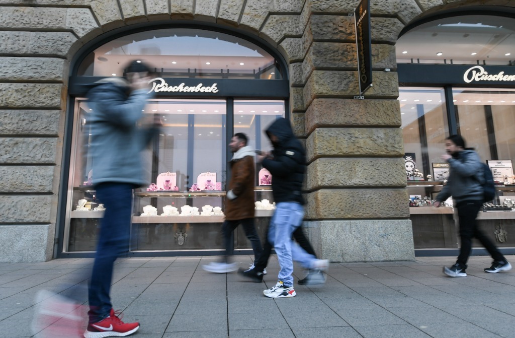 1月15日,行人從德國法蘭克福一家商場(chǎng)的櫥窗前走過。新華社記者逯陽攝