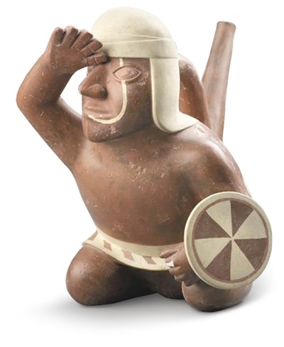 在展廳醒目位置,擺放著一件莫切文明時(shí)期(公元100年—800年)的戰(zhàn)士陶器,他皮膚深褐、高眉大眼、神情堅(jiān)毅,腰間系著白色外衣,頭上戴著布帽。這名戰(zhàn)士身體微微前傾,跪坐在地,左手持盾牌,右手搭于額前,向著遠(yuǎn)方眺望。這件戰(zhàn)士陶器身高雖不足20厘米,卻體態(tài)生動(dòng),僅使用簡練的線條與棕白兩色,便將一位莫切戰(zhàn)士形象刻畫得活靈活現(xiàn)。在雷瓜伊文明時(shí)期(公元前200年—公元650年)的動(dòng)物陶器展臺(tái)前,總是有不少孩童圍繞。兇猛的美洲虎、呆萌的羊駝、神秘的未知生物,各種陶器與石器器身僅用黑、紅、白三色裝飾,形態(tài)各異、生動(dòng)活潑,透過玻璃柜懵懂地望向千年后的小觀眾們。