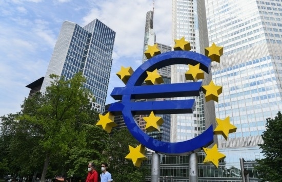 2021年6月28日,人們從位于德國法蘭克福的歐元雕塑前走過。新華社記者逯陽攝