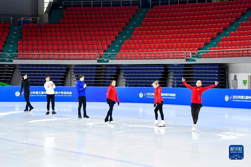 在長春五環(huán)體育館,參加第三屆中俄冬季青少年運(yùn)動會的俄羅斯花樣滑冰運(yùn)動員在賽前場地適應(yīng)性訓(xùn)練時(shí)向場邊的中國運(yùn)動員致意(2022年12月15日攝)。新華社記者 許暢 攝