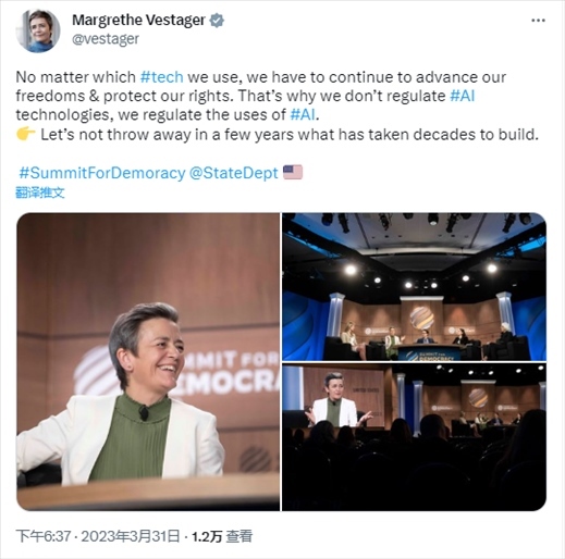 同一天,歐盟“適應數(shù)字時代的歐洲”委員會執(zhí)行副主席瑪格麗特·維斯塔格(Margrethe Vestager)在社交媒體上表示,她對人工智能的態(tài)度傾向于“不限制人工智能技術的發(fā)展,但會監(jiān)管其使用”。