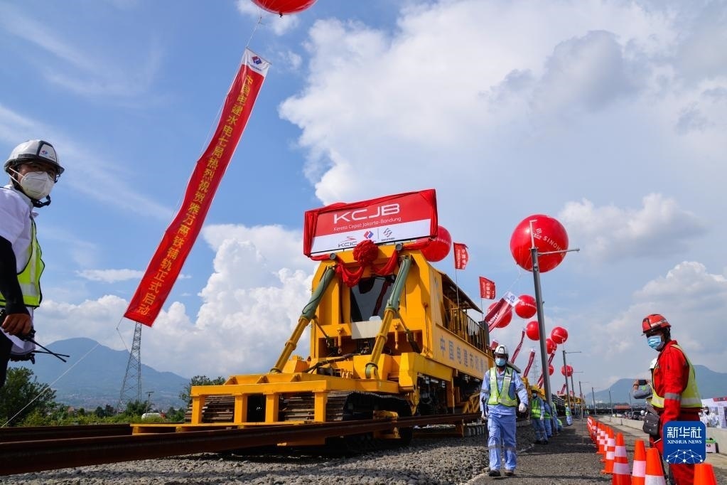 工作人員在印度尼西亞萬(wàn)隆雅萬(wàn)高鐵鋪軌施工現(xiàn)場(chǎng)作業(yè)(2022年4月20日攝)。新華社記者 徐欽 攝