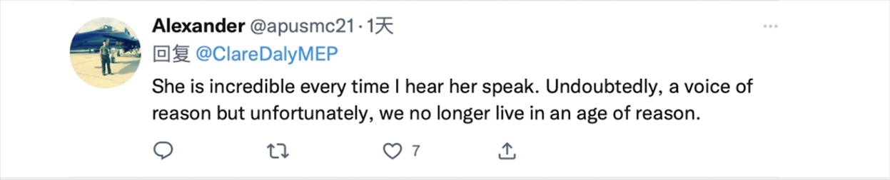 克萊爾·戴利28日在推特上發(fā)布了一條她于19日在歐洲議會全體會議上發(fā)言的視頻,她在視頻上方配文稱,“針對中國可恥的殖民傲慢應該留在過去。問題很簡單。我們是想成為我們大西洋朋友的附庸,還是想與我們最大的貿(mào)易伙伴保持和平、獨立的關系?這個伙伴40年來沒有向任何人投過一顆炸彈?!?/p>