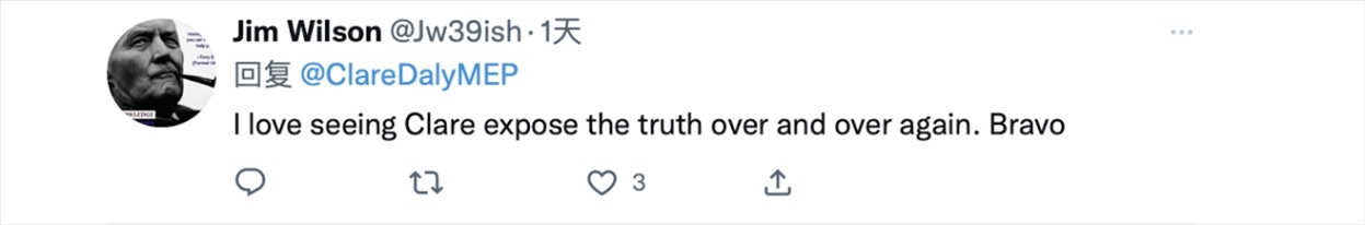 此前,克萊爾·戴利在接受環(huán)球時報記者采訪時,當被問及在歐洲議會中是否會因為自身的對華立場而受到壓力,戴利稱,那或許不是一種“壓力”,而是一種反華的種族主義和陳舊的觀念作祟。愛爾蘭的媒體把我和我的同事米克·華萊士妖魔化了,因為我們發(fā)表的一些評論被中國媒體報道,他們就給我們貼上“專制政權傀儡”的標簽。這種無知不能改變什么,所以我覺得不用擔心。我們的工作是利用歐洲議會這個平臺來代表歐洲公民的利益,而與中國保持良好關系符合歐洲公民的利益。