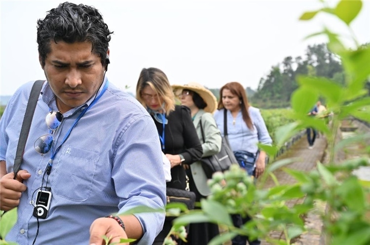 在南川區(qū)大觀鎮(zhèn)藍莓產(chǎn)業(yè)示范基地,代表團成員觀摩了先進的全基質(zhì)種植技術(shù)。對于這片種植面積2000余畝、帶動當(dāng)?shù)?000余名農(nóng)民就近就業(yè)的項目,一名代表團成員有感而發(fā):“洪都拉斯也是一個農(nóng)產(chǎn)品生產(chǎn)大國,期待未來兩國能夠開展技術(shù)培訓(xùn)、技術(shù)援助方面的合作,將中國的種植經(jīng)驗、智能的種植系統(tǒng)傳播到洪都拉斯,為當(dāng)?shù)孛癖妿ブ赂坏臋C遇,促進當(dāng)?shù)氐纳a(chǎn)和發(fā)展?!?/p>