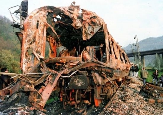 1999年3月24日,以美國為首的北約向南斯拉夫聯盟開始發(fā)動大規(guī)??找u,武力干涉科索沃危機。資料照片顯示被北約飛機炸毀的火車。新華社發(fā)