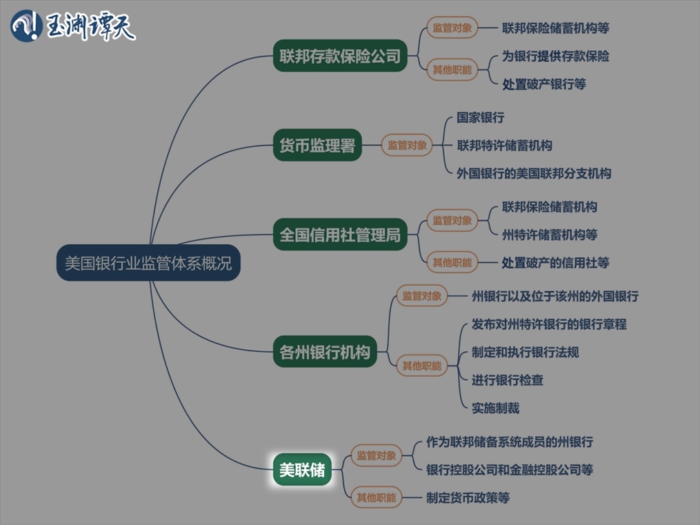 讓我們重新看回這張圖,可以看到,按照美國銀行業(yè)監(jiān)管體系的分工,美聯(lián)儲負責(zé)監(jiān)管所有成員銀行的正常運行。