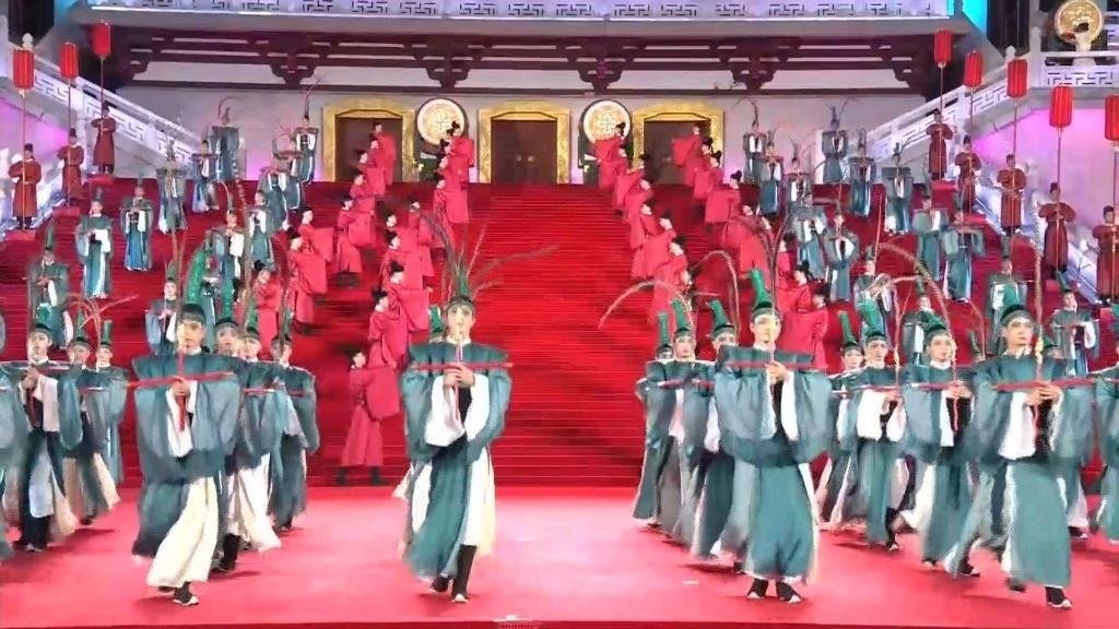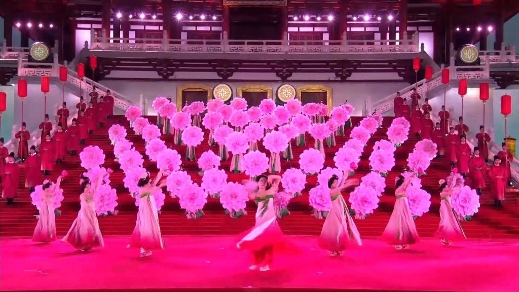 紫云樓前,禮樂和鳴,明快有力的古代佾舞、絢麗婀娜的芙蓉花舞,表達了古都西安人民的熱情好客,體現(xiàn)了中華文化兼容并蓄的精神風(fēng)貌。