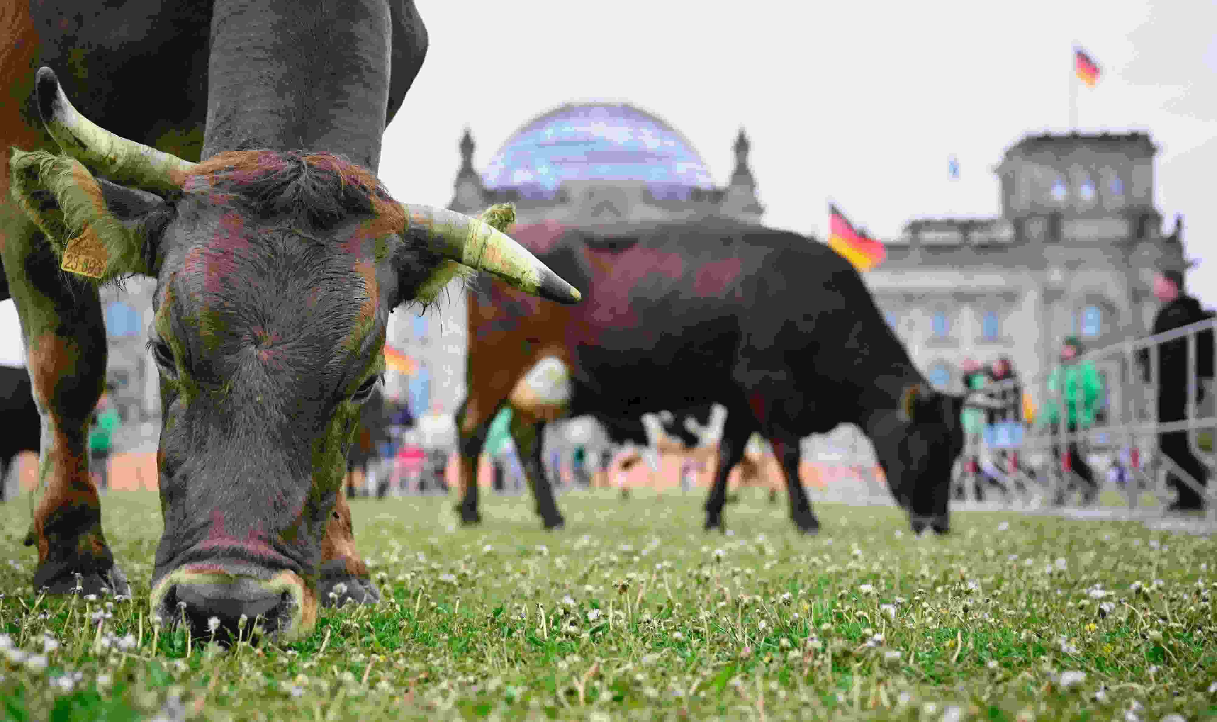 當(dāng)?shù)貢r(shí)間2023年5月16日,德國(guó)柏林,牛群被驅(qū)趕到國(guó)會(huì)大廈前吃草?;顒?dòng)組織者希望通過(guò)這一行動(dòng),呼吁政治家們采取更多措施來(lái)促進(jìn)牧場(chǎng)農(nóng)業(yè)。 視覺中國(guó)