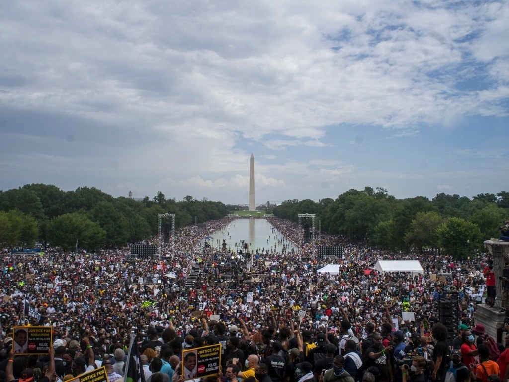 2020年8月28日,人們在美國首都華盛頓林肯紀(jì)念堂附近參加反種族歧視和暴力執(zhí)法示威活動(dòng)。新華社發(fā)(阿蘭攝)