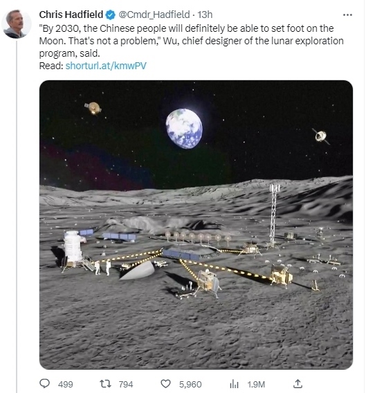 據(jù)報道,加拿大航天局前宇航員克里斯·哈德菲爾德在社交媒體推特上轉(zhuǎn)發(fā)了CGTN的一篇報道,他同時寫道,“中國探月工程總設(shè)計師吳偉仁說,‘到2030年,中國人的足跡一定能夠踏上月球。這不是個問題。’”