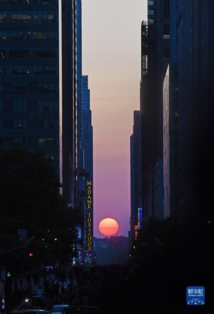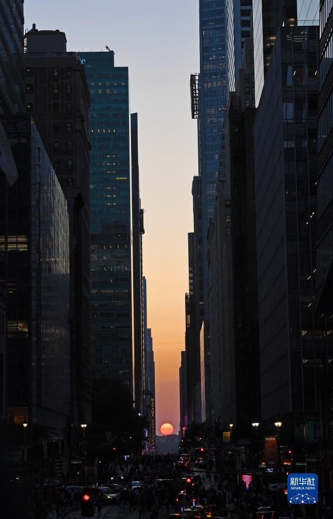 當日,紐約出現(xiàn)“曼哈頓懸日”景觀?!奥D懸日”是紐約市標志性景觀,每年5月和7月出現(xiàn)兩次,指日落時太陽正好出現(xiàn)在曼哈頓東西向街道正上方、似乎懸在兩側(cè)高樓大廈之間的戲劇性畫面。新華社記者 李睿 攝